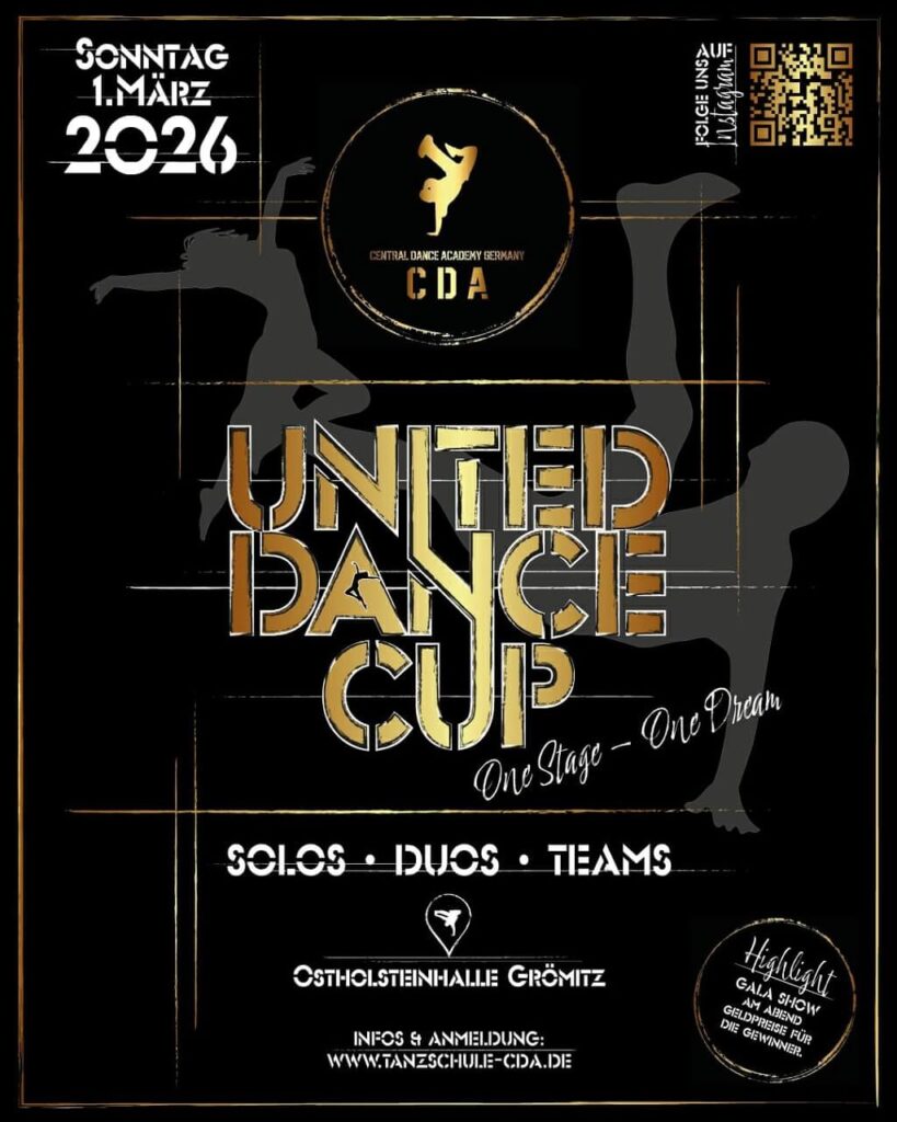 “ Wir freuen uns, Tänzerinnen und Tänzer aus allen Altersgruppen und Stilrichtungen in Grömitz begrüßen zu dürfen. Freut euch auf einen unvergesslichen Tag voller Kreativität, Energie und spektakulärer Auftritte. Ob Solo, Duo oder Gruppe – hier stehen der Spaß am Tanz, die Leidenschaft und der Zusammenhalt im Vordergrund! ”
